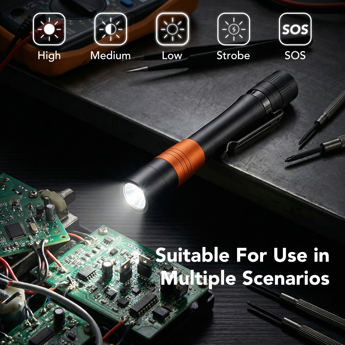 Angetrieben von einer speziellen 10750-Lithium-Batterie ist diese IPX6-Wasserdichte Penlight für den täglichen Aufwand gebaut. Mit 5 Lichtmodi, darunter ein 3LM 'Low' zum Lesen und einen SOS-Modus, ist er sowohl für Arbeit als auch für Notfälle einsatzbereit.